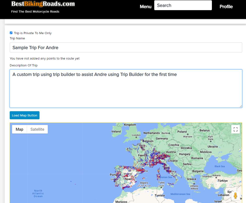 After the appropriate countries have been selected for the trip from the list, the trip builder map shown contains all the route data from the BestBikingRoads.com database for the countries selected, when create your custom trip, it will not automatically snap to the routes, so you are free to choose which of the routes you would like to follow by simply plotting over them. As you have observed, the route data lines are thinner on the trip builder than on the regular routes, this is because of the volume of data on the map, if they are shown thicker, the map itself is very obscured and difficult to see.